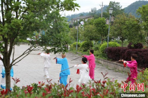 8月10日,旅居贵州省遵义市桐梓县九坝镇的避暑游客在晨练。李甜甜摄