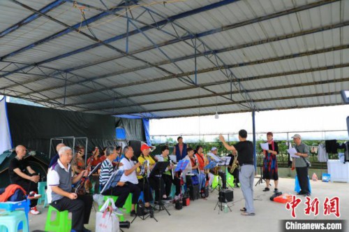 8月10日,在贵州省遵义市桐梓县九坝镇避暑的旅居游客们,练习唱歌和器乐演奏。李甜甜摄