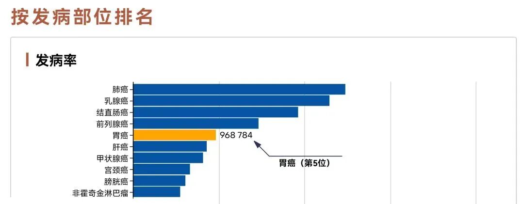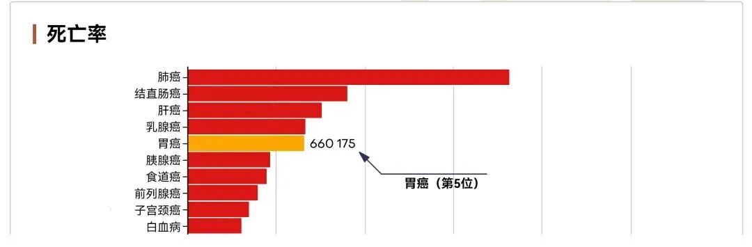 根据国际研究机构(IARC)的数据,2022年全球新增胃癌病例约97万例,仅次于肺癌、乳腺癌、结直肠癌、前列腺癌,位列第5;死亡约66万例,仅次于肺癌、结直肠癌、肝癌、乳腺癌,同样位列第5。