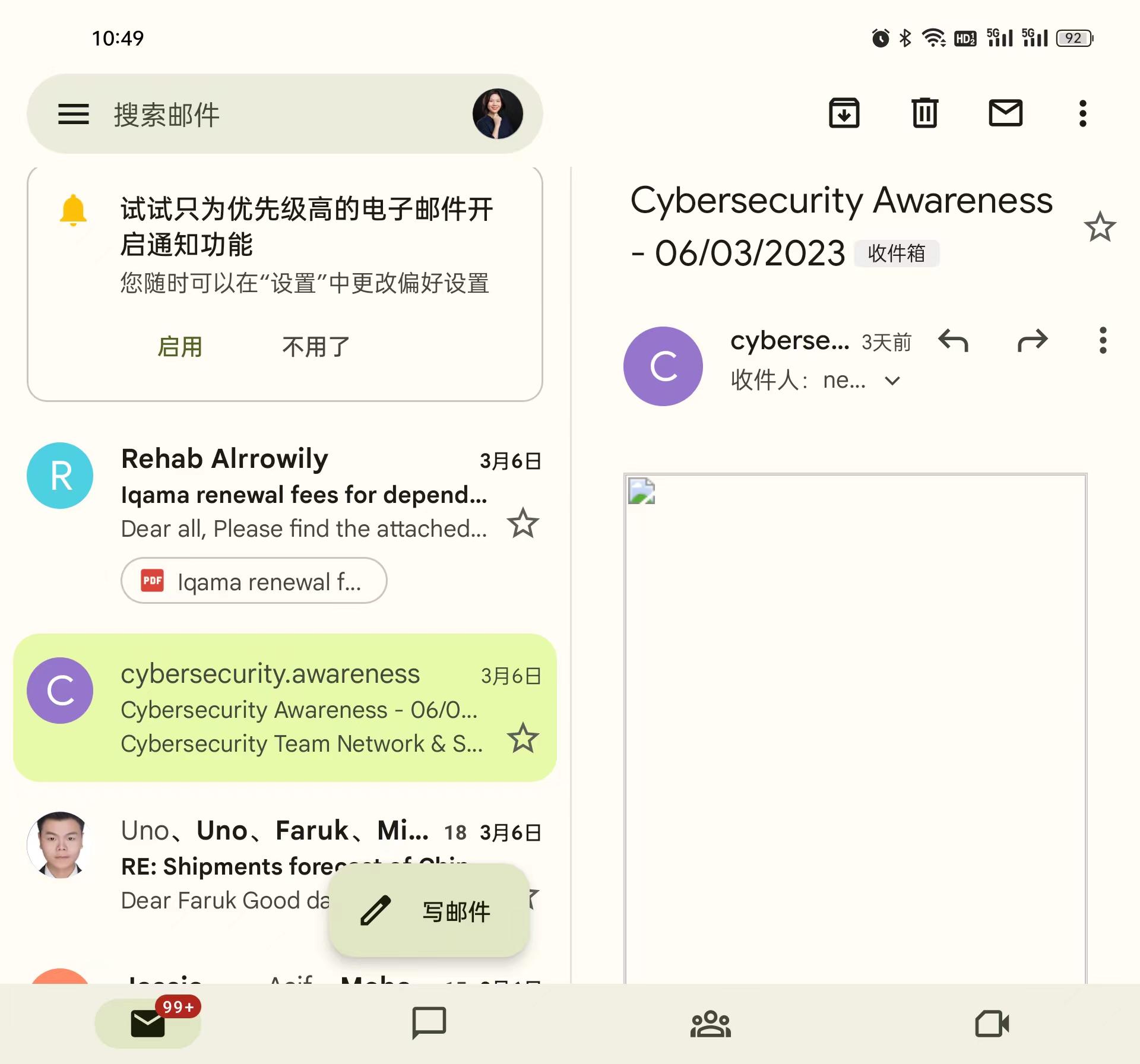 红红当时买的机型是OPPO Find N2,拥有一块7.1英寸主屏。她用这款折叠屏,最满意的点是屏幕够大,可以分屏显示两个页面,比如同时打开微信和一个视频App,而且写邮件时可以一半显示列表、另一半进入内页。而且,红红从事外贸工作,有时要用笔记本展示产品图给客户看,现在用折叠屏代替,方便很多。